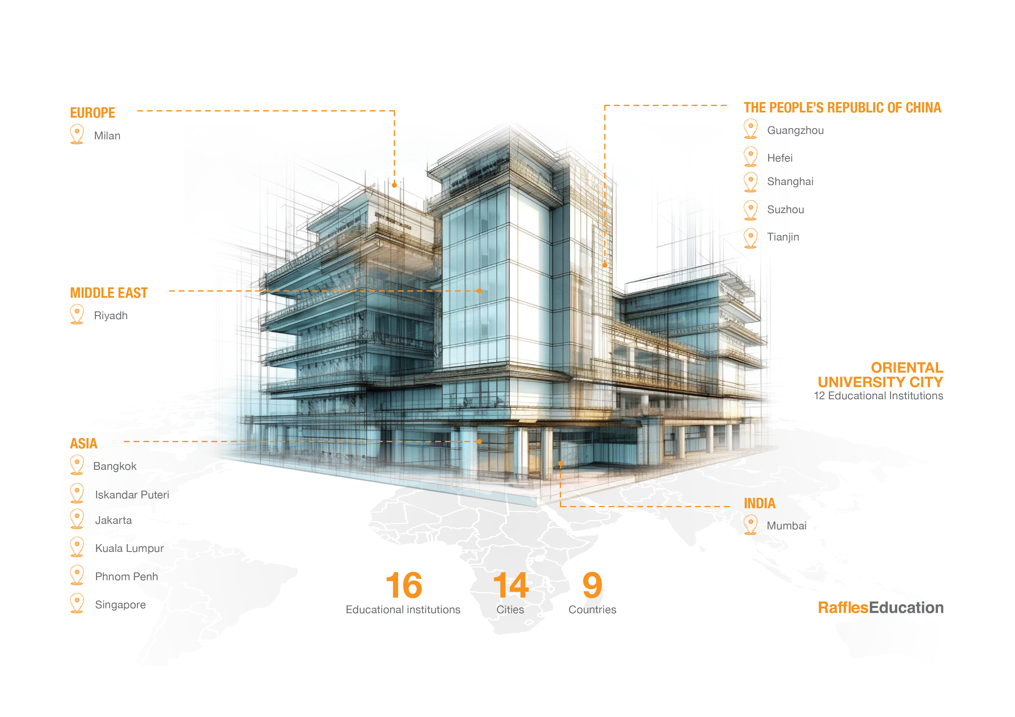 Since establishing its first college in Singapore in 1990, RafflesEducation has grown to provide a full spectrum of education services through a vast network of 16 educational institutions across 9 countries in Asia Pacific and Europe: Cambodia, India, Indonesia, Italy, Malaysia,Saudi Arabia, Singapore, Thailand, and the People’s Republic of China.